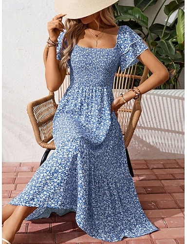 Dame Midikjole Kjole med A-linje Fritid utendørs Ut på byen Standard passform Blomstret Kortermet Firkantet hals Blå Svart Rød Lilla Sommer Vår