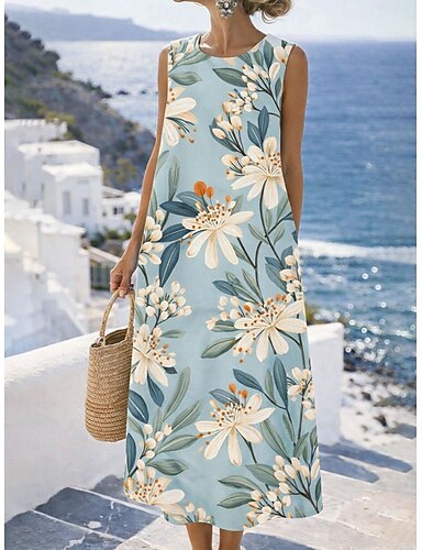 Dame Midikjole Solkjole Skiftkjole Ferie Fritid utendørs Løstsittende Blomstret Grafisk Geometrisk Ermeløs Crewneck Blå Kakifarget Sommer Vår
