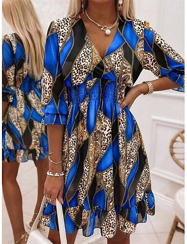 Dame Mini kjole Kjole med A-linje Ferie Fritid utendørs Ut på byen Normal Blomstret 3/4 ermer V-hals Blå Sommer Vår Høst