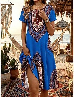 Dame Maxikjole Boho-kjole Uformell kjole Swingkjole Kjole med A-linje Bohem Etnisk Fritid Daglig Normal Paisly Kortermet V-hals Blå Sommer Vår