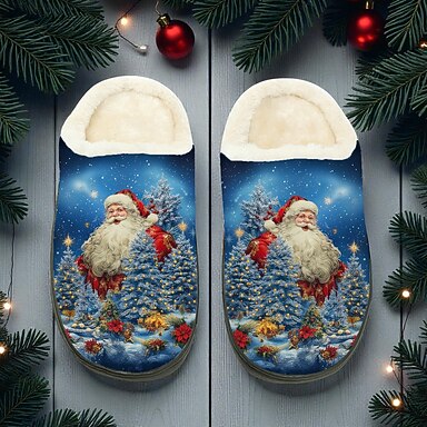Herre juletøfler med julemotiv - vinterlandskap med julenissen, myke fleecefôrede tøfler for koselige kvelder, julefester og komfort innendørs