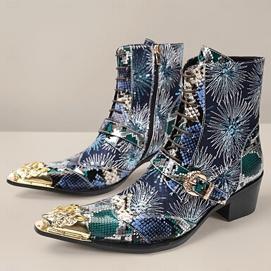 Blå herrestøvler i skinn med slangemønster og metallisk tåhette – trendy, stilig design, perfekt for kveldsarrangementer og moteriktige antrekk