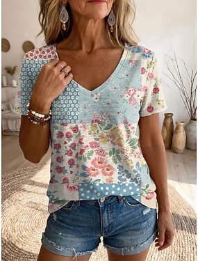 Dame T skjorte Trykt mønster Blomstret Grafisk Årgang Stilfull Klassisk Kortermet V-hals Vanlige topper Avslappet Daglig Ut på byen Blå Grønn Sommer Vår