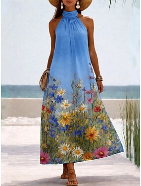 Dame Maxikjole Solkjole Kjole med A-linje Ferie Strand Løstsittende Blomstret Grafisk Ermeløs Grimehals Blå Gul Rosa Sommer Vår