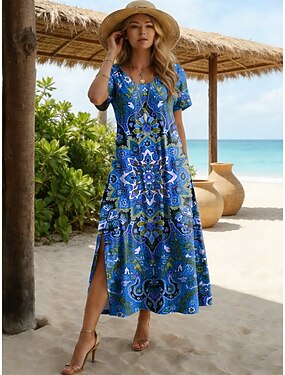 Dame Midikjole Maxikjole Sommerkjole Ferie Fritid Bohem Daglig Ferie Stevnemøte Løstsittende عادي Kortermet Cowl-hals V-hals Blå Hvit Sommer Vår