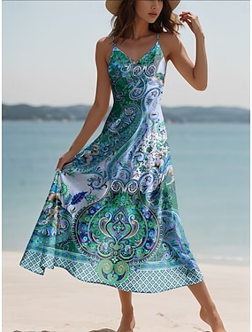 Dame Maxikjole Kjole med A-linje Fritid Strand Normal Grafisk Paisly Ermeløs V-hals U-hals Blå Sommer Vår