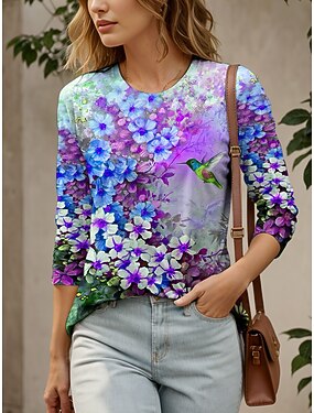 Dame T skjorte Trykt mønster Nyanse Blomstret Grafisk Årgang Stilfull Klassisk Langermet Crew-hals Rund hals Vanlige topper Daglig Blå Lilla Regnbue Vår Høst Vinter