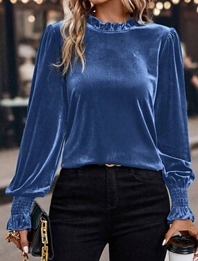 Dame Fløyel Elegant Pent Bluse Rynket عادي Årgang Stilfull Langermet Crew-hals Vanlige topper Daglig Ferie Ut på byen Blå Militærgrønn Grønn Rose Rosa Høst Vinter