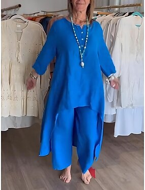 Dame Skjorte Todelt sett Imitert bomullslin Linbukser Bukser Sett Langermet V-hals Helfarge Snorer Mote Gatemote Dagligdagstøy Stevnemøte Blå Svart Hvit Vår Normal