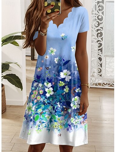 Dame Mini kjole T skjortekjole Kjole med A-linje Sommerkjole Elegant Ferie Fritid Normal Blomstret Grafisk Kortermet V-hals Blå Rosa Lilla Grønn Sommer Vår