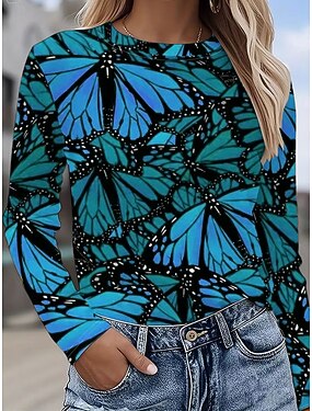 Dame T skjorte Trykt mønster Grafisk Sommerfugl Årgang Mote Stilfull Langermet Crew-hals Rund hals Vanlige topper Daglig Helg Blå Lilla Oransje Grønn Sommer Vår Høst