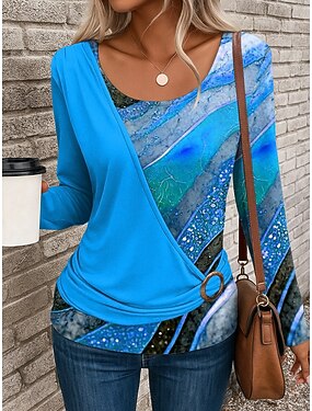 Dame T skjorte Trykt mønster Grafisk Geometrisk Årgang Stilfull Klassisk Langermet Crew-hals Rund hals Lange topper Daglig Blå Vår Høst
