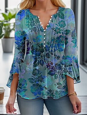 Dame T-skjorte V-hals Ombre Blomstermønster Grafisk Elegant 3/4 Lengde Ermer Vanlige Topper Daglige Gå ut Knapper Salvie Grønn Hvit Blå Lilla Grønn Sommer Vår Høst