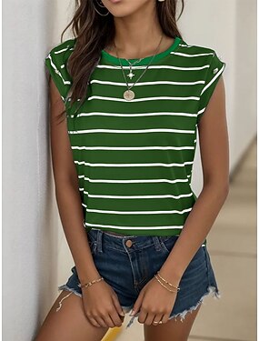 Dame T skjorte T-skjorte Trykt mønster Stripet Mote Stilfull Fritid Kortermet Crew-hals Vanlige topper Daglig Ut på byen Helg Brun Grønn Sommer Vår