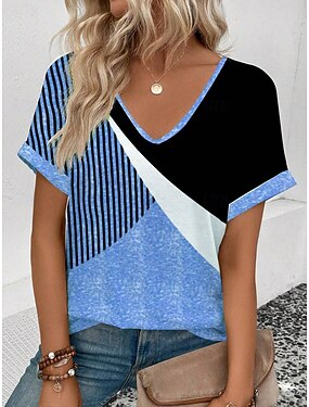 Dame T skjorte Fargeblokk Trykt mønster Grafisk Geometrisk Abstrakt Årgang Stilfull Klassisk Kortermet V-hals Vanlige topper Daglig Helg Ferieklær Blå Gul Grønn Kakifarget Sommer Vår