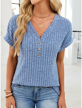 Dame Strukkede strikkede topper T skjorte Nyanse Grafisk Stilfull Klassisk Kortermet Henley Vanlige topper Daglig Blå Svart Rosa Sommer Vår