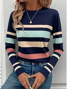 Dame T skjorte Trykt mønster Grafisk Geometrisk Stripet Årgang Mote Stilfull Langermet Crew-hals Vanlige topper Daglig Blå Svart Rosa Lysebrun kaffe Sommer Vår Høst
