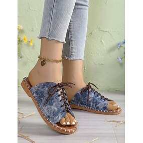 dame denimblå snøresandaler - slitte, flate sandaler med åpen tå for sommerens uformelle utflukter og strand &ferie