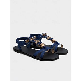 Dame marineblå bohemske flate sandaler med blomstermønster og perler, vintage-inspirerte, komfortable sommersko med t-stropper for uformelle utflukter, strandferier og hverdagsbruk