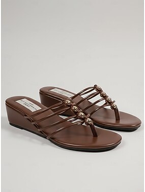 Brune sandaler i kunstskinn med gullfarget metallstang til dame – minimalistiske, flate sommersko for strandferier og feriesteder &stilige reisende