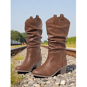 Brune, løse damestøvletter til leggen – støvletter i western-stil med kraftig hæl for høstmote, utendørsarrangementer og uformelle dager