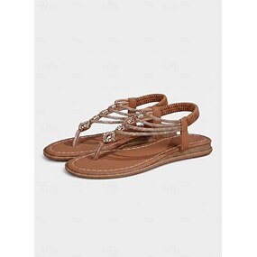 Damesandaler med bohemsk mønster, brune strass-t-stropper og elastisk bak, elegante sommersko for uformelle utflukter, strandturer og feriereiser