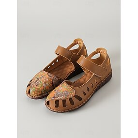 damesandaler med blomsterkile – komfortable vintage-sko med t-stropper for turer på landet og hagearrangementer