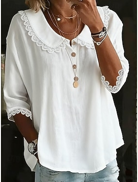Dame Popover skjorte Sommerskjorte Uformell skjorte Bluse Blondestrim Helfarge Ferie Stilfull Fritid 3/4 ermer Aftæpning Vanlige topper Daglig utendørs Ferie Blå Hvit Gul Rosa Sommer Vår Høst