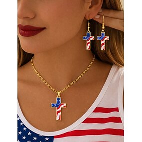 Sett med korskjede og øredobber i legering til dame, patriotiske smykker i gull og sølv, sett med amerikansk flagganheng og øredobber til USAs 250-årsjubileum, uavhengighetsdagen, fritidsklær og ferie