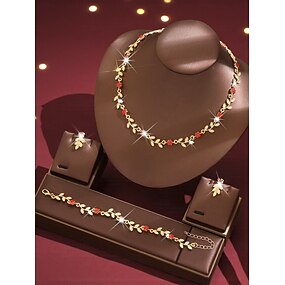 kvinners gullblad &rødt krystallsmykkesett - delikat halskjede, dråpeøreringer &matchende armbånd, romantisk blomstertilbehør til fester, bryllup &spesielle arrangementer