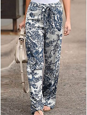 Dame Imitert bomullslin Sommerbukser Palazzo bukser Mote Gatemote Komfort Ankel-lengde Medium Midje Blomst Lomme Elastisk midje comfy Utendørs Bekvem Gate Dagligdagstøy Ut på byen Blå Kald Hvit Hvit