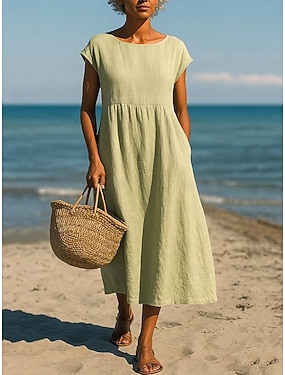 Dame Midikjole Skiftkjole Solkjole Kjoler i bomullslin Uformell kjole Grunnleggende Fritid Daglig Feriereise Ut på byen Normal Ren farge Ermeløs Splitt hals Blå Gul Rosa Grønn Sommer Vår Høst