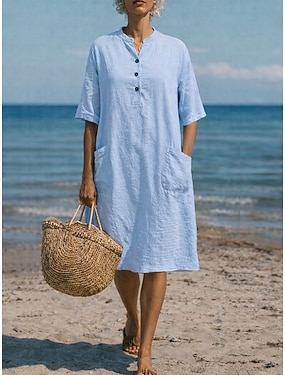 Kjole i bomull og lin kvinner maxi A-linje kjole avslappet hverdagslig løs passform ensfarget halv erme V-hals blå sommer vår høst