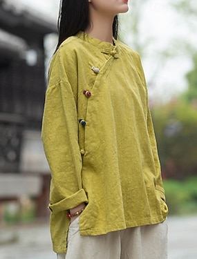 Dame Skjorte Skjorter i bomullslin Bluse Knapper Asymetrisk kant عادي Årgang Stilfull Langermet Kinesisk Krave Vanlige topper Daglig Ferie Hvit Gul Mørkegrå Høst Vinter
