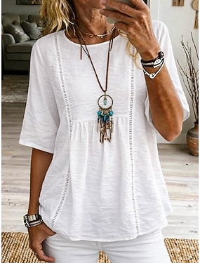 Dame Bluse Imitert bomullslin Helfarge Daglig Stilfull Grunnleggende Halvlange ermer Crew-hals Vanlige topper Daglig Blå Hvit Sommer Vår Høst