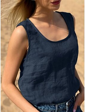 Dame Bomull lin vest Imitert bomullslin Helfarge Stilfull Fritid Ermeløs Øsehals Vanlige topper Daglig Navyblå Grønn Sommer Vår