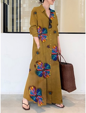Dame Maxikjole Imitert bomullslin Skiftkjole Ferie Fritid Daglig Normal Blomstret Langermet Skjortekrage Gul Rød Navyblå Oransje Sommer Vår Høst