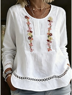 Dame Skjorte Bluse Imitert bomullslin Rynket Lapper Broderi Blomstret Elegant Stilfull Grunnleggende Langermet Crew-hals Vanlige topper Daglig Ferie Ut på byen Blå Hvit Rosa Lilla Sommer Vår Høst