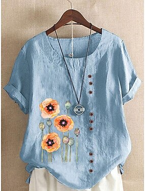 Dame Bluse Knapper Trykt mønster Blomstret Grafisk Årgang Tropisk Stilfull Kortermet Crew-hals Vanlige topper Ferie Blå Rosa Brun Sommer Vår