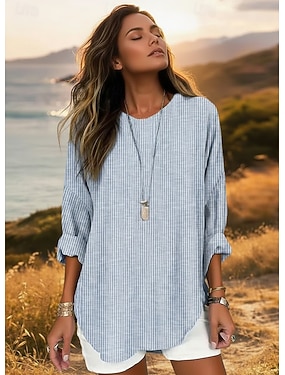 Dame Skjorte Imitert bomullslin Lapper Stripet Daglig Stilfull Moderne Langermet Crew-hals Vanlige topper Daglig Feriereise Fest Blå Grå Vår Høst