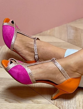 Damesandaler med åpen tå og T-stropp i fargeblokk i kunstskinn og justerbar stropp for både hverdagsbruk og kveldsbruk.