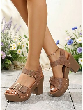 Svarte damesandaler med kraftig hæl og spenne – komfortable platåsko med åpen tå for hverdagsbruk, hagefester og hverdagsbruk