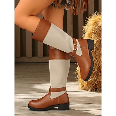 Brune ridestøvler i kunstskinn med spenne og lerret til dame – uformelle tofargede knehøye støvletter for jobb, reise og utendørsbruk