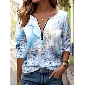 Dame T skjorte Glidelås Trykt mønster Grafisk Abstrakt Marmortrykk Elegant Årgang Stilfull Langermet Rund hals Hals med hakk Vanlige topper Daglig Helg Lyseblå Vår Høst Vinter