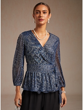 Dame Dressy topper Flettet Metallisk Elegant Lanterne Erme V-hals Vanlige topper Bryllupsgjest Festkveldsklær Forretningsklær Navyblå Vår, Høst, Vinter, Sommer