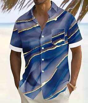 Herre Geometrisk Marmor Abstrakt kunst Skjorte Sommerskjorte Skjorte med knapper Kortermet Fashion Casual Feriereise Ferie Gateklær Sommer Aftæpning 3D-utskrift Front One Lomme Lin som skjorte Blå