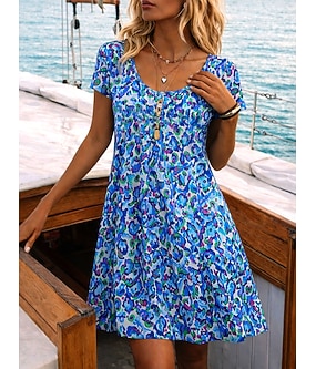 Dame Mini kjole Solkjole T skjortekjole Kjole med A-linje Sommerkjole Ferie Fritid Daglig Strand Ferie Normal Blomstret Grafisk Kortermet Crew-hals Blå Lilla Grønn Sommer Vår