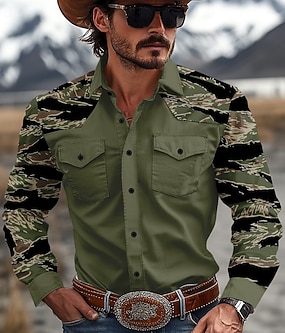 Herre Kamuflasje Kamuflasje Farge Western skjorte Cowboyskjorte Langermet Vestlig Fritid utendørs Vår Høst Aftæpning 2 lommer Svart Brun Grønn Kakifarget
