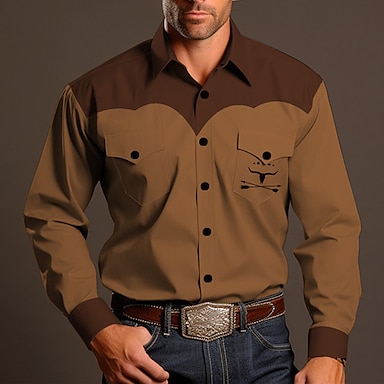 Herre Cowboy Skjorte Western skjorte Cowboyskjorte Langermet Årgang vestlig stil utendørs Gate Fritid / hverdag Høst vinter Aftæpning Knapper Trykt mønster Brun Kakifarget