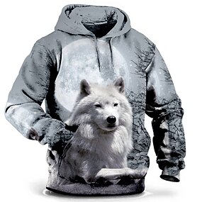 Herre Ulv 3D-utskrift Grafiske trykk Hattetrøje Pullover hettegenser-genser Hettegensere Mote Gatemote Langermet Med hette Feriereise Arbeid Dagligdagstøy Grågrønn Svart og Hvit Lomme Vår & Vinter